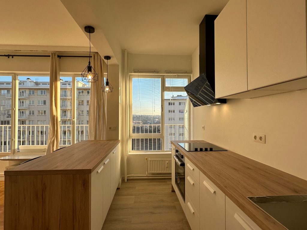 Cuisine neuve et entièrement équipée (vitrocéramique, frigo, rangements)